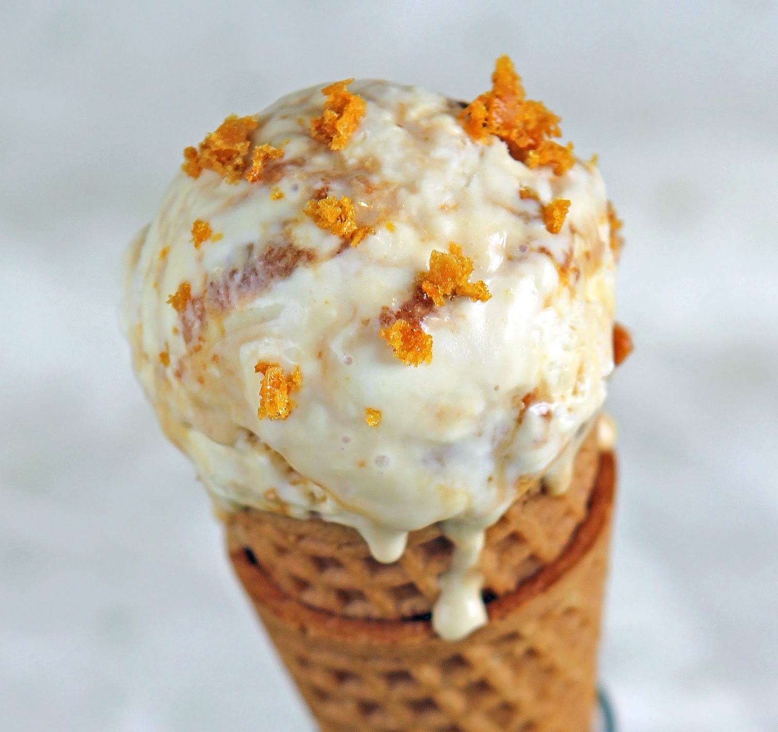 When the honeycomb is mixed into the ice cream, some of it melts and creates the most delicious swirl throughout the ice cream.